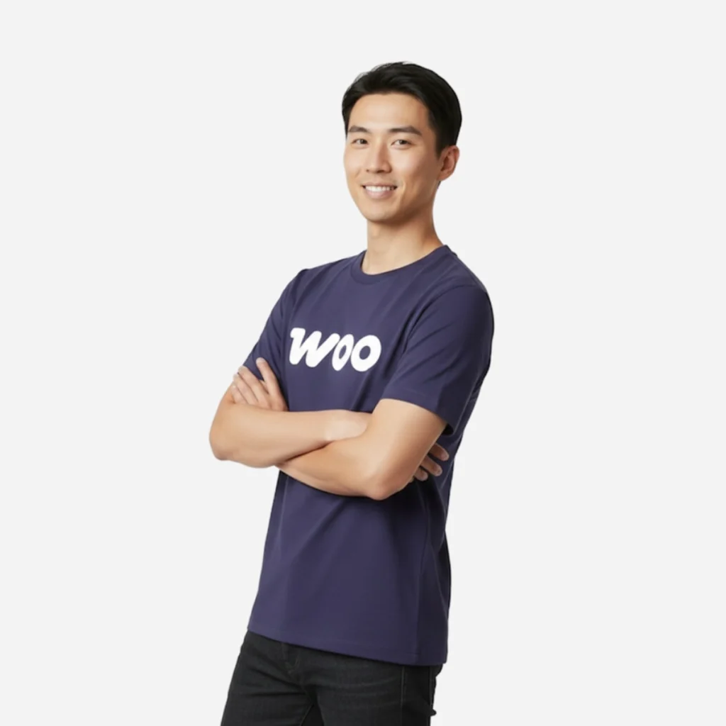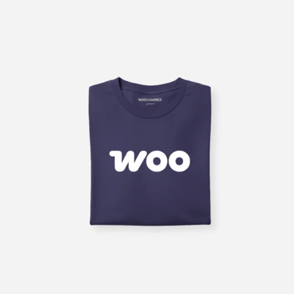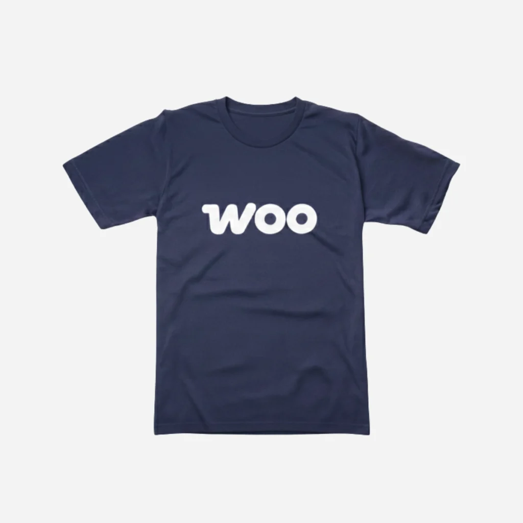 A soft ring-spun cotton tee in navy with a standout white “WOO” logo—perfect for daily wear, brand-forward looks, or easy layering.