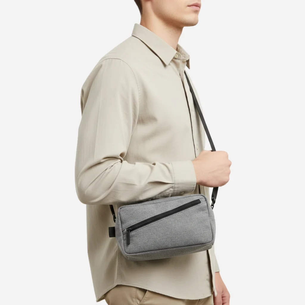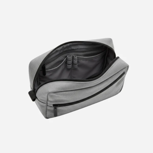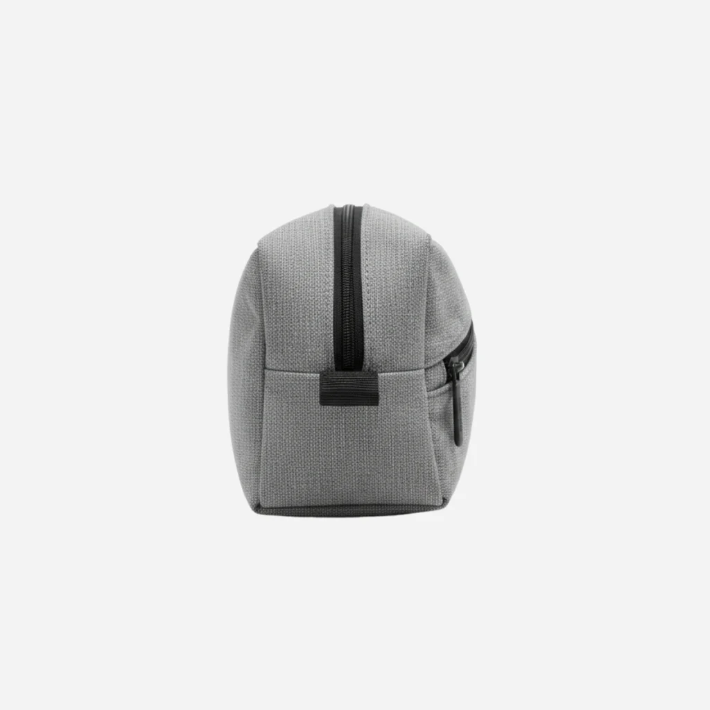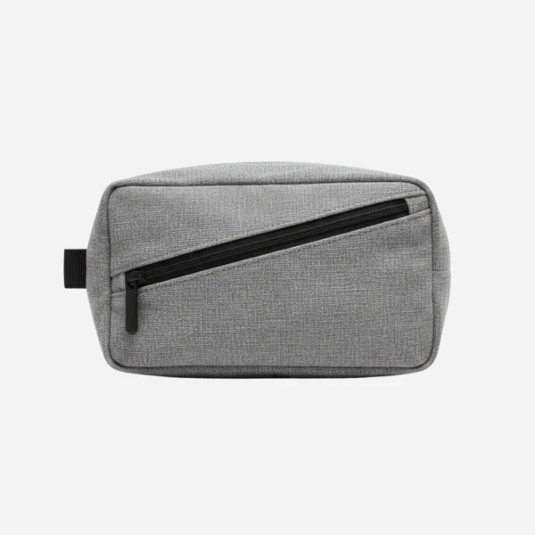 A textured light-gray travel pouch with a signature diagonal front pocket—padded, practical, and perfect for keeping chargers, earphones, and small essentials neatly organized on the go.